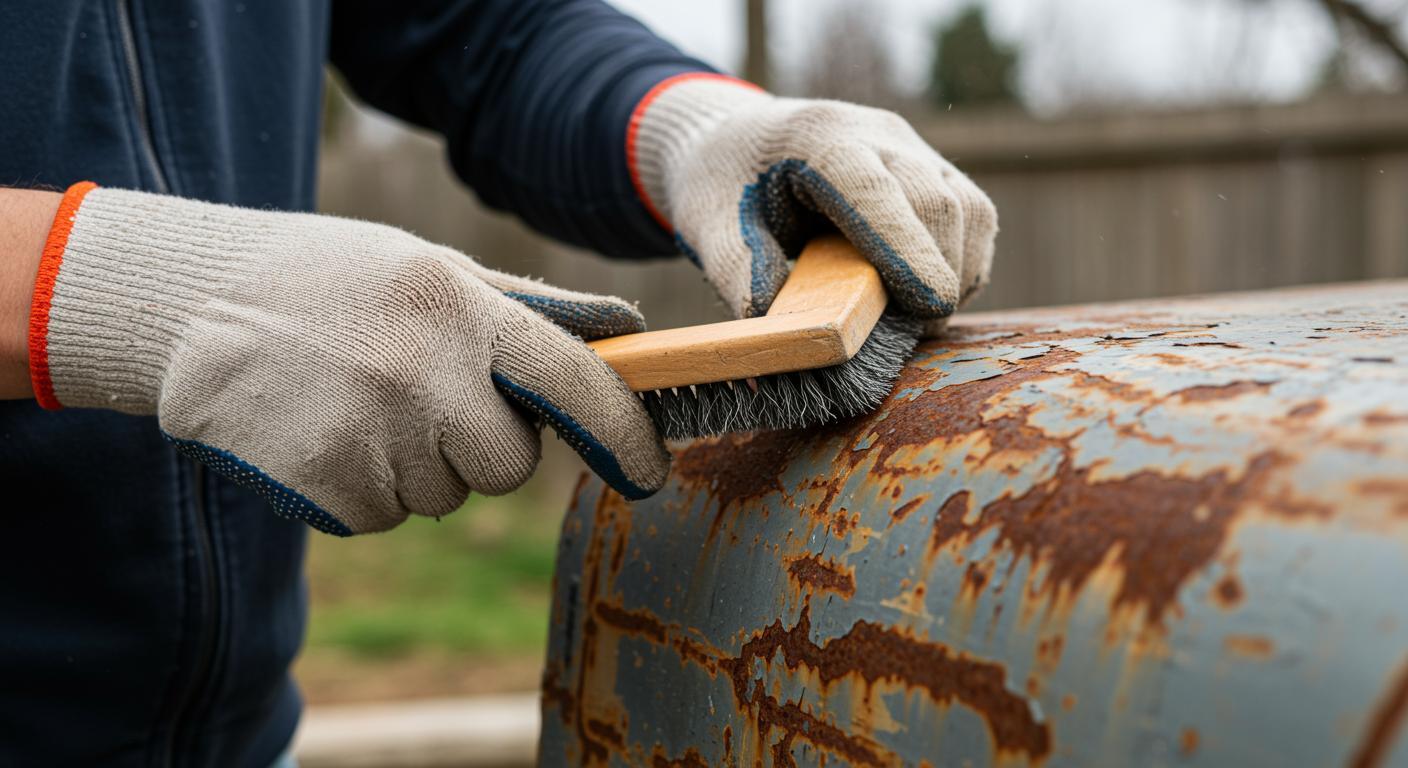 Ржавчина — главный враг металла. Ее нужно удалять как можно тщательнее. Рыхлую ржавчину счищайте металлической щеткой или наждачной бумагой до чистого металла. Если остались небольшие очаги в виде темных точек, обработайте их преобразователем ржавчины. Это химический состав, который вступает в реакцию с оксидами железа и превращает их в прочный защитный слой, готовый к грунтованию.